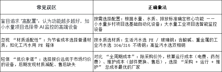企業(yè)在選擇成套污水處理設(shè)備時(shí),易陷入 “只看采購價(jià)、忽視長期成本”“盲目追求高端配置” 等誤區(qū),需從 “需求匹配、成本核算、風(fēng)險(xiǎn)規(guī)避” 三個(gè)維度科學(xué)選型: